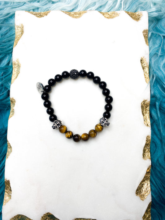 Men's Tigers Eye & Black Onyx Crystal Bracelet with Skull Accents