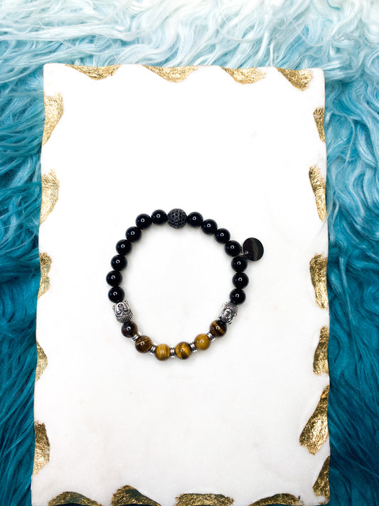 Men's Tigers Eye & Black Onyx Crystal Bracelet with Buddha Head Accents