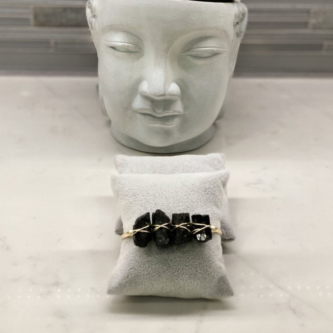 The 4 Stone Black Tourmaline Crystal open bracelet is elegant & easy to wear. This sleek bracelet features 4 black tourmaline stones on a gold band with emboss to secure your treasure in place. What makes it special is that the adjustable bracelet can be worn by anyone regardless of the wrist size.