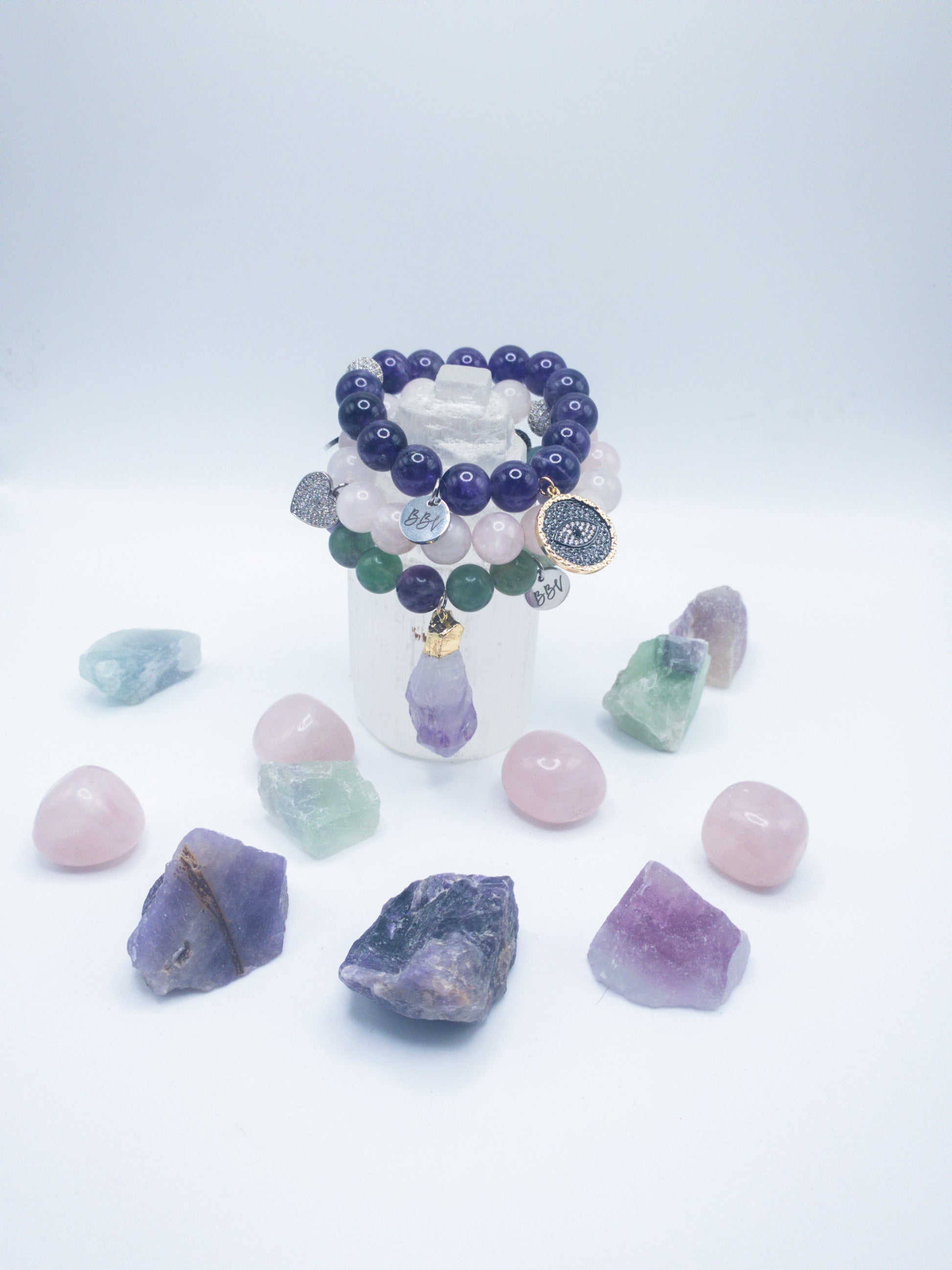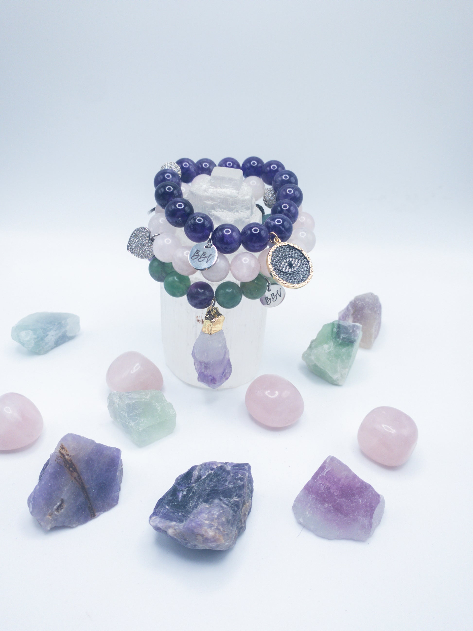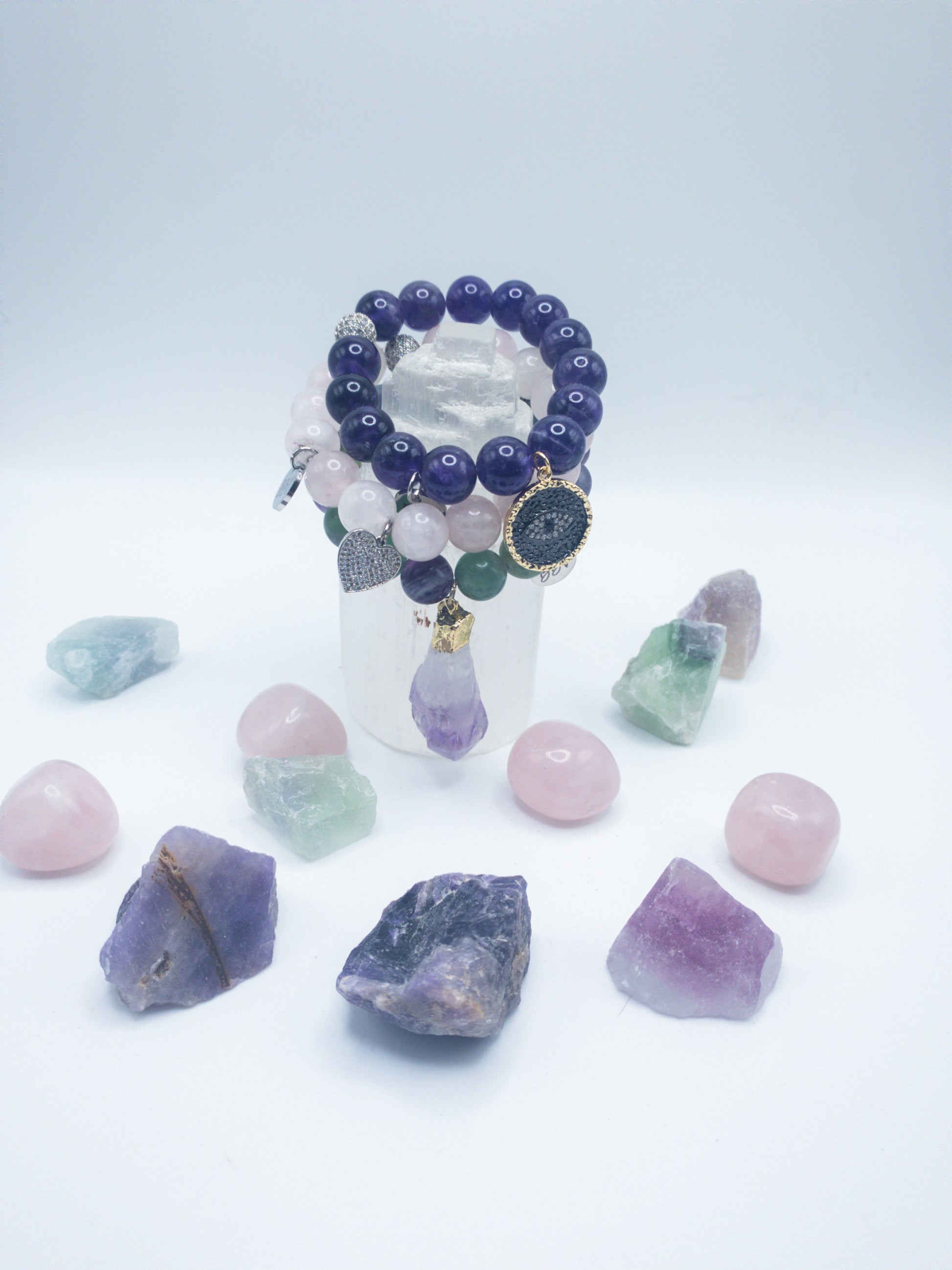 Rainbow fluorite bracelet with large amethyst chunk charm and pave spacer bead; amethyst crystal bracelet with large evil eye charm and pave spacer bead; rose quartz bracelet with a silver heart charm and pave spacer bead