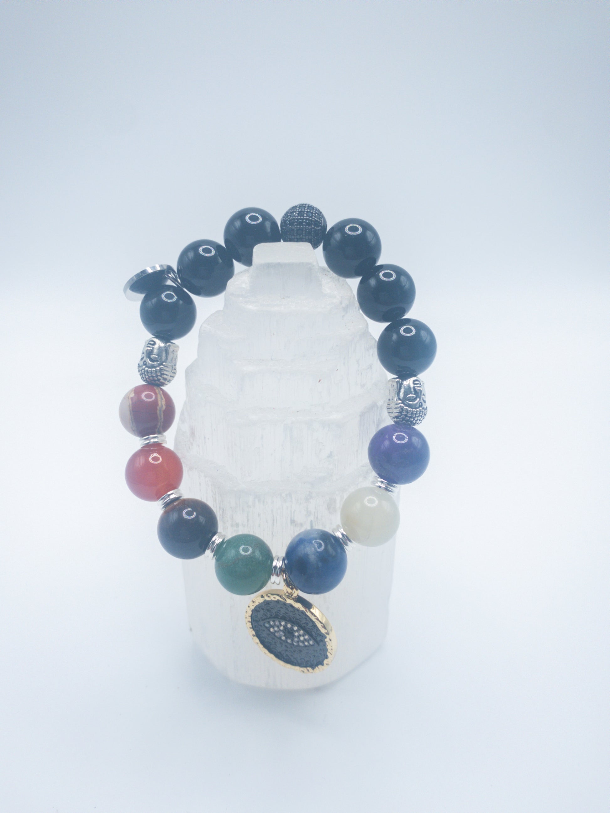 Single bracelet adorned with black tourmaline bead accents, 2 silver Buddha heads, silver accents, large evil eye charm & pave spacer bead