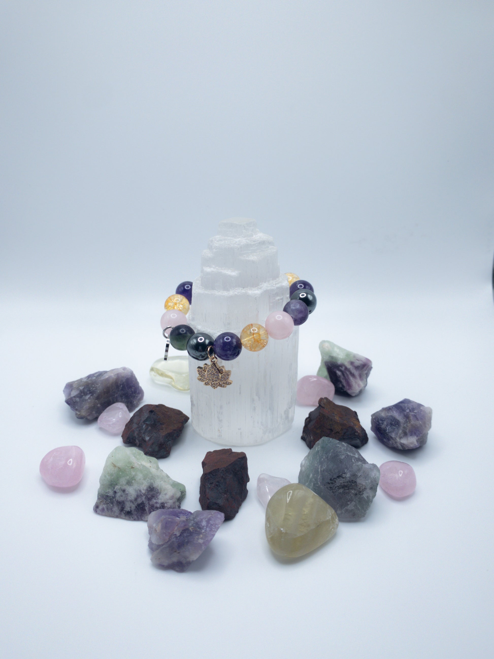 The Yoga Vibes stack contains the following 5 crystals (all 12 mm) as well as a pave spacer bead and lotus flower charm -