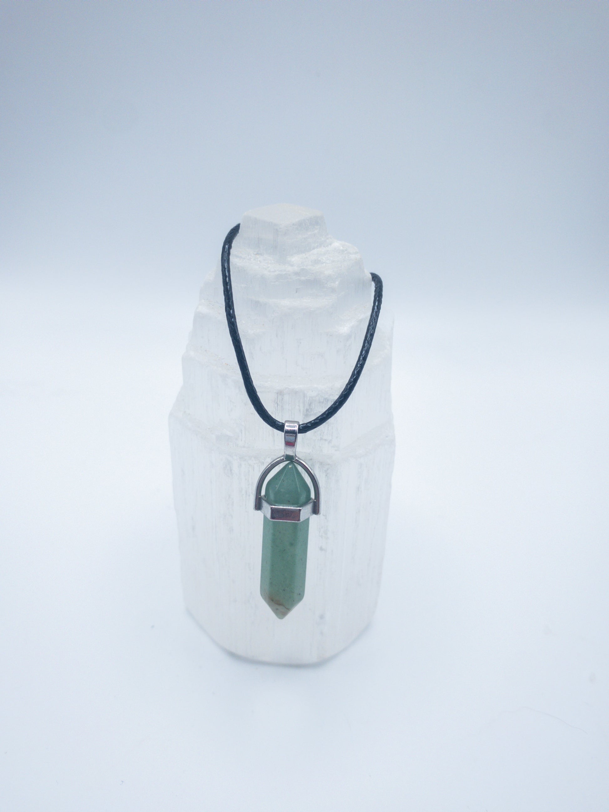 This beautiful necklace features a green aventurine crystal point on a black strand or silver chain.