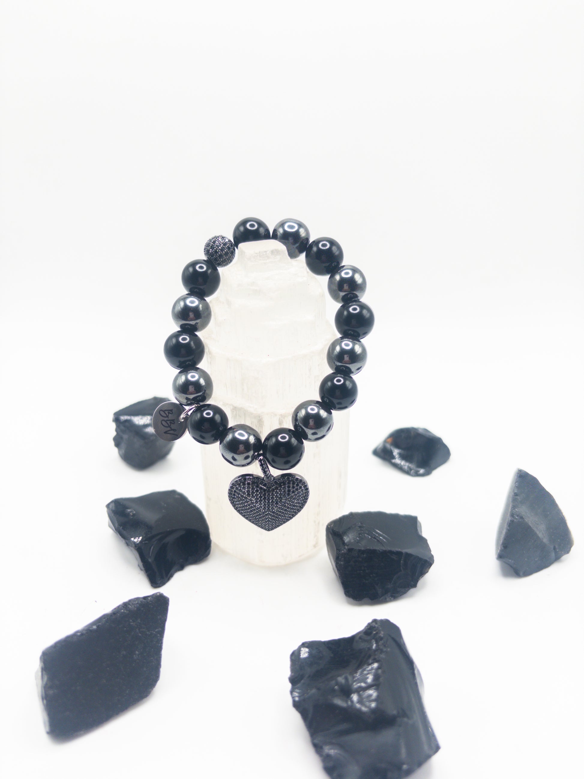 Hematite& Black Tourmaline bracelet adorned with large black pave heart charm; as well as a pave spacer bead