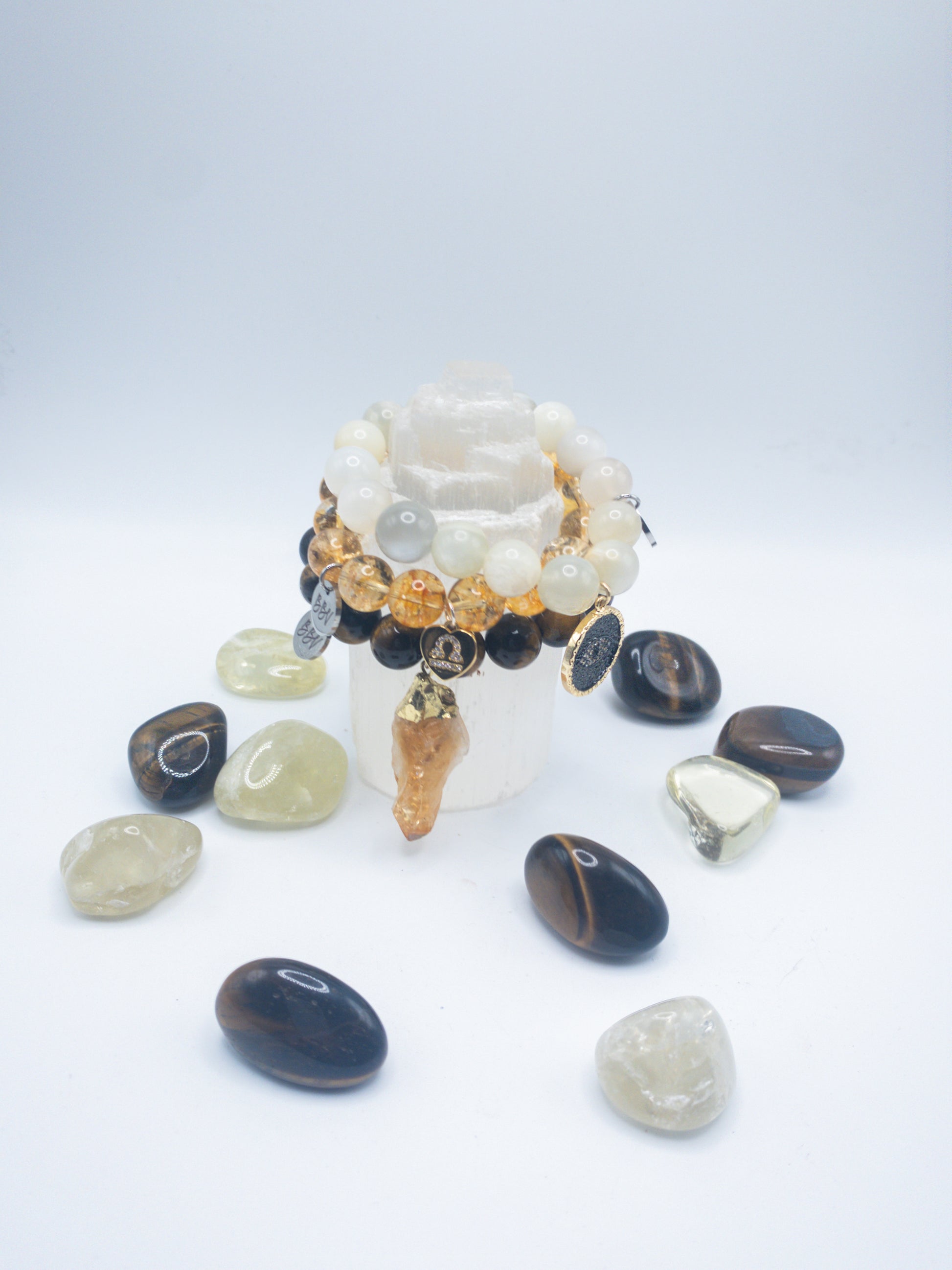 Moonstone bracelet adorned with large evil eye charm and pave spacer bead; citrine crystal bracelet adorned with gold zodiac Libra pave charm and pave spacer; tigers eye bracelet with large citrine chunk charm and pave spacer bead