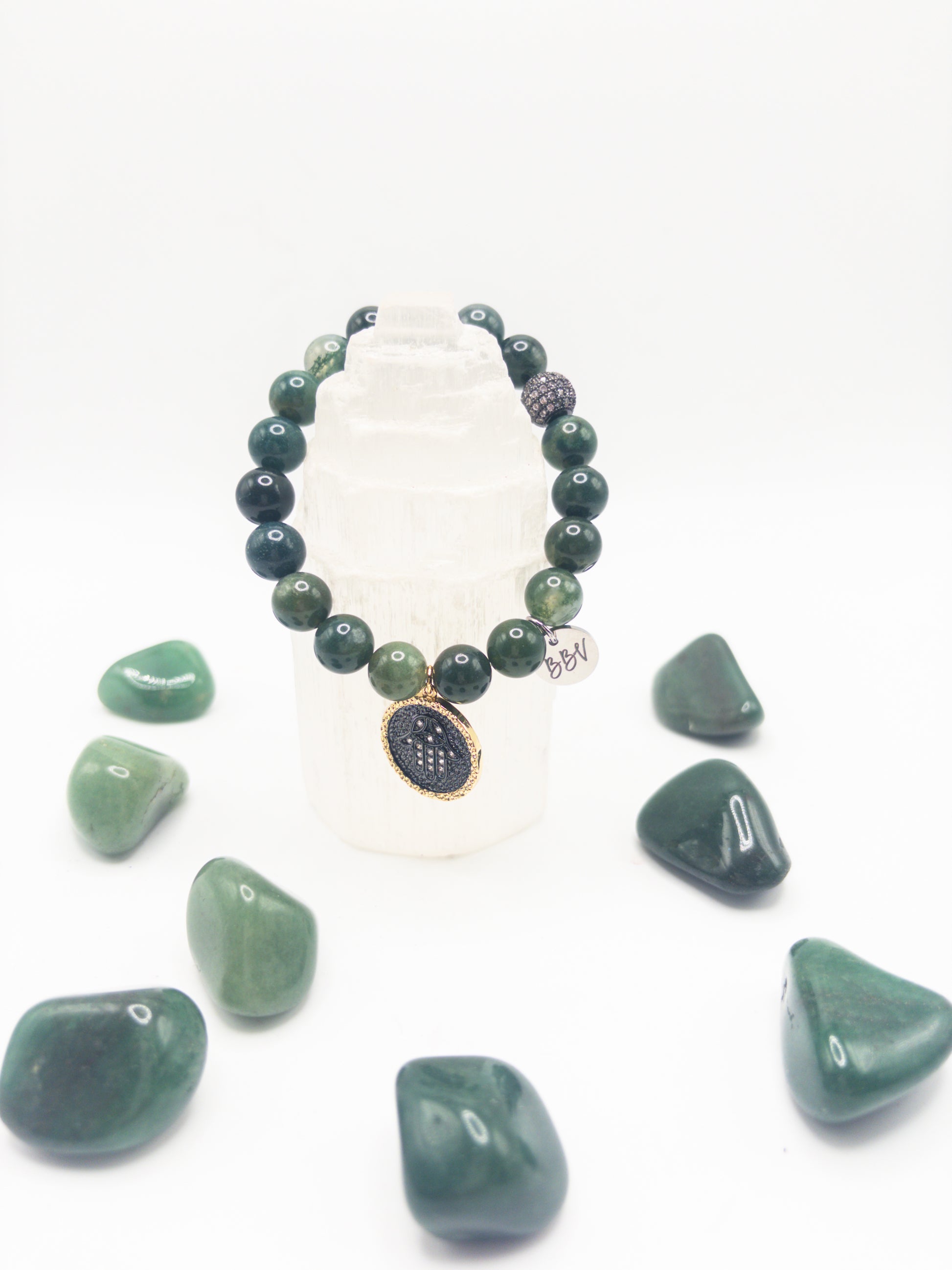 Moss Agate Crystal Bracelet is associated with root & heart chakras.