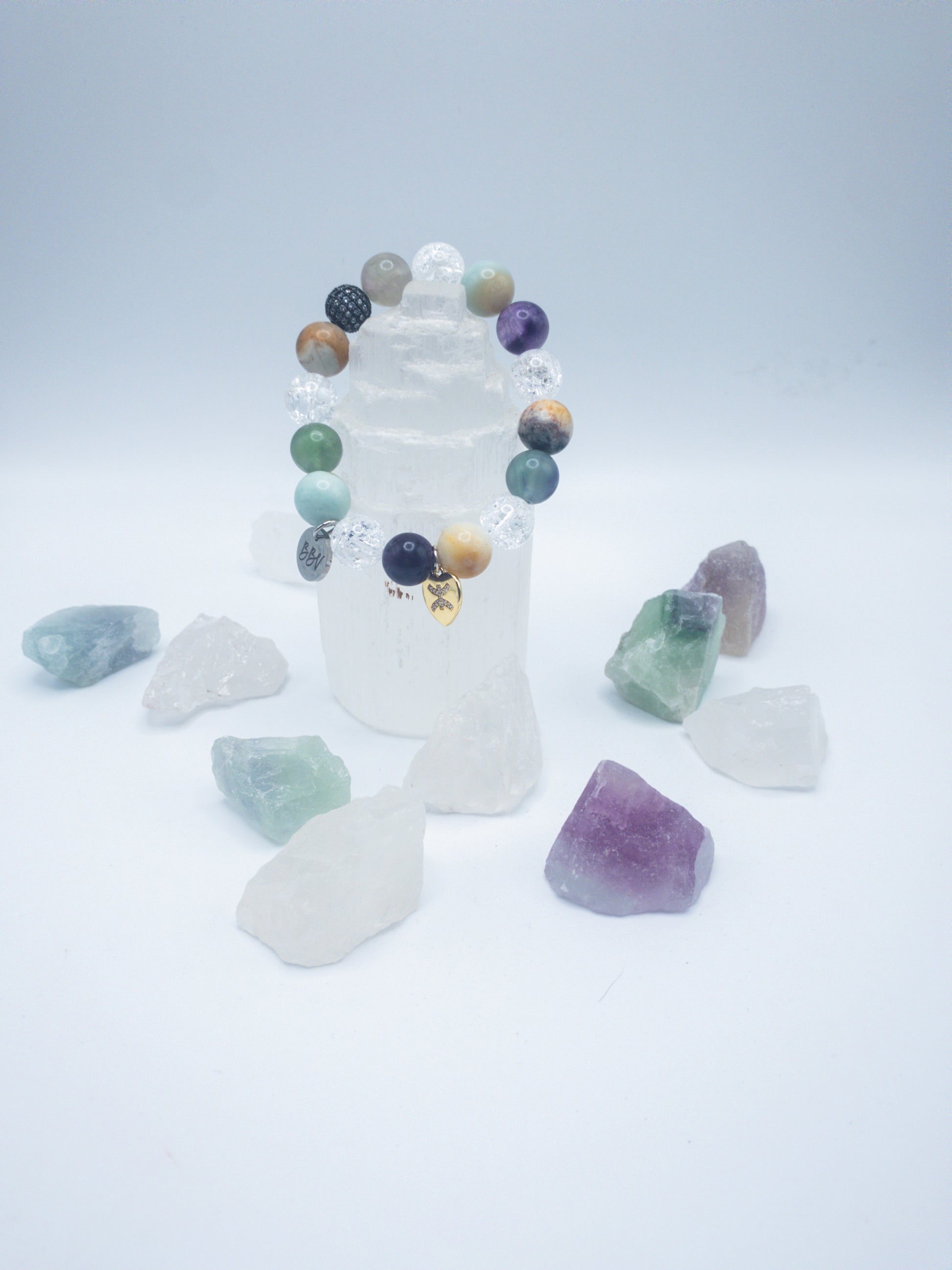 All bracelets are handmade and crafted with high quality natural gemstones. Each bracelet is uniquely yours. Natural gemstones vary slightly in color and size. Remove before exposure to water or chlorine. Avoid direct contact with products such as lotion, hairspray, makeup, and perfume. As with any jewelry, it is best to remove bracelets before sleeping and physical activity. It is best to roll bracelets over the wrist to help preserve the quality and stretch. Always remember to treat your bracelets gently with care and good vibes.