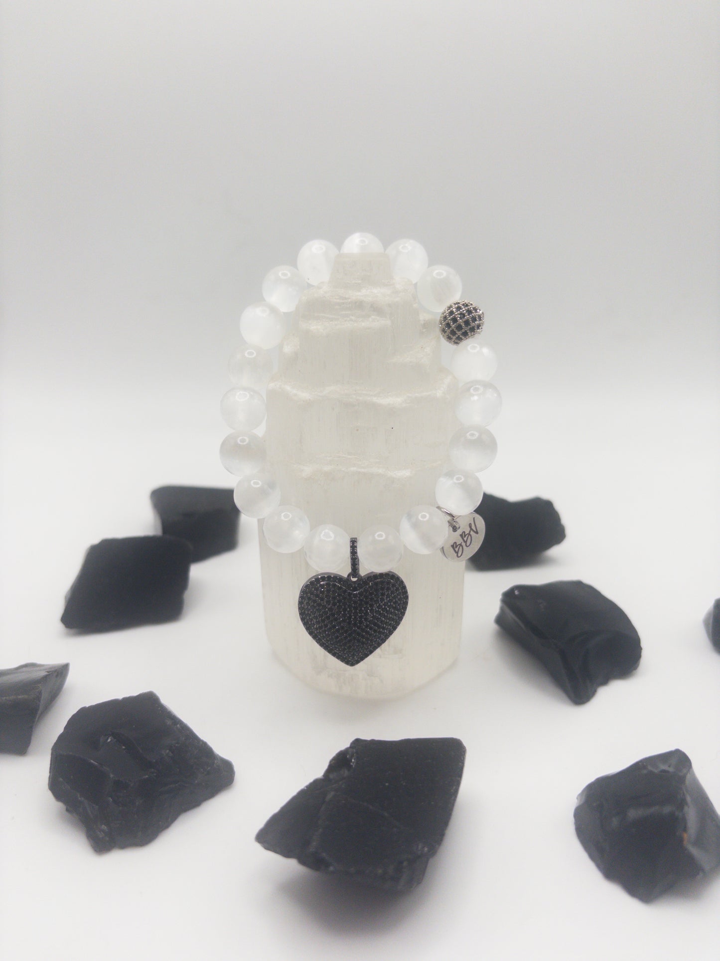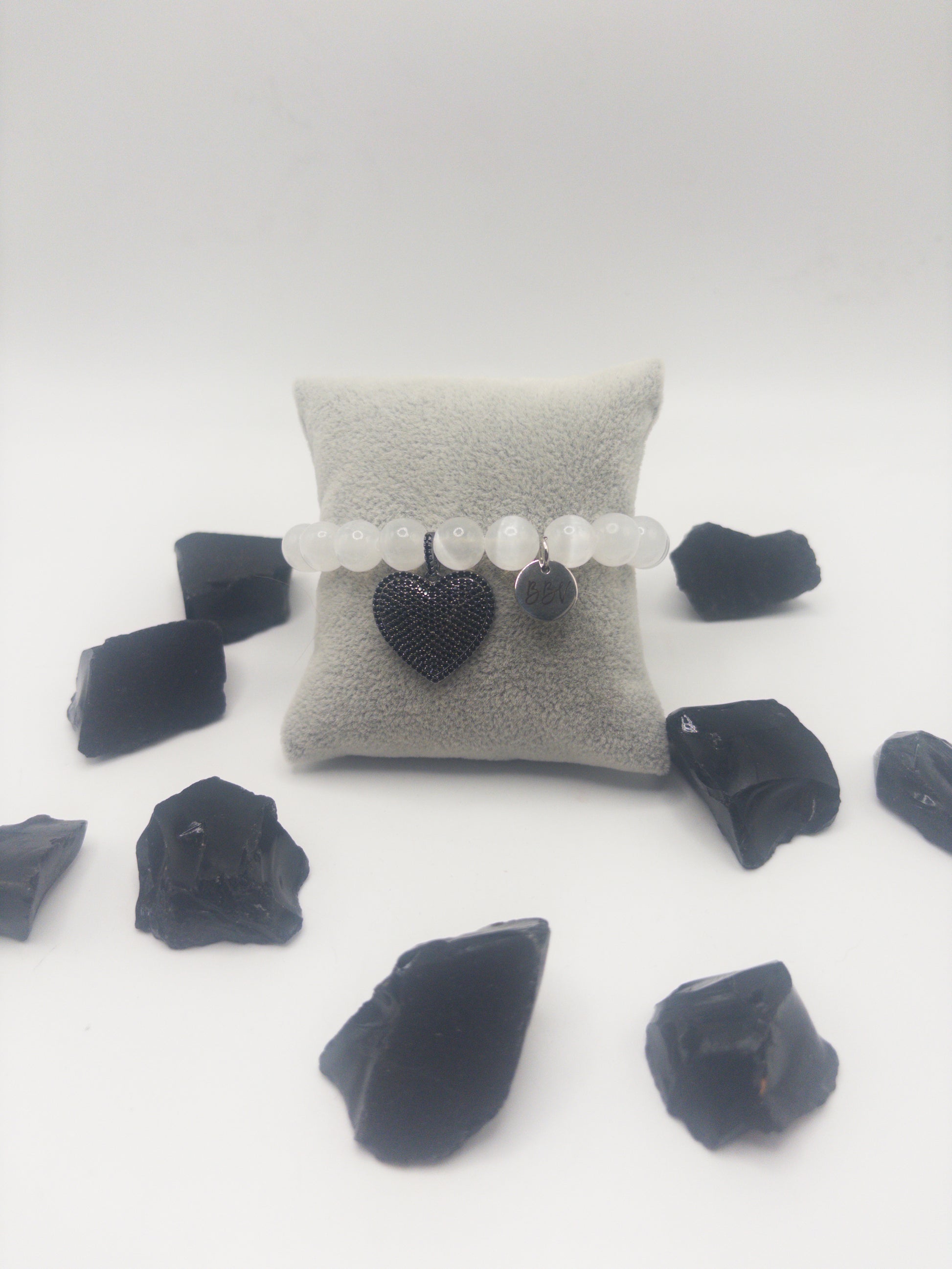 Single bracelet with pave spacer bead and large black heart pave charm; or bracelet without large black pave heart charm