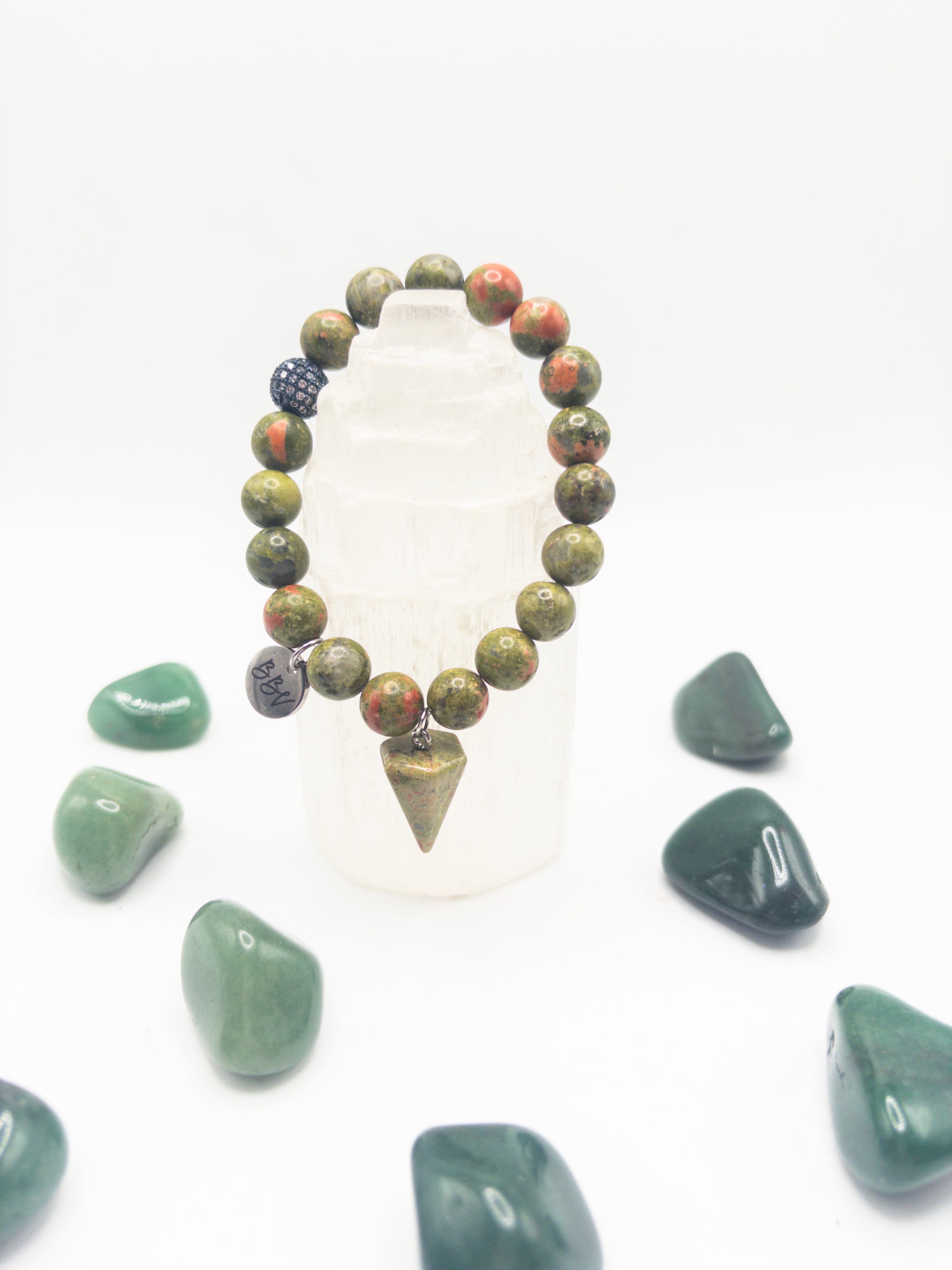 Single bracelet adorned with a large unakite point charm and pave spacer bead