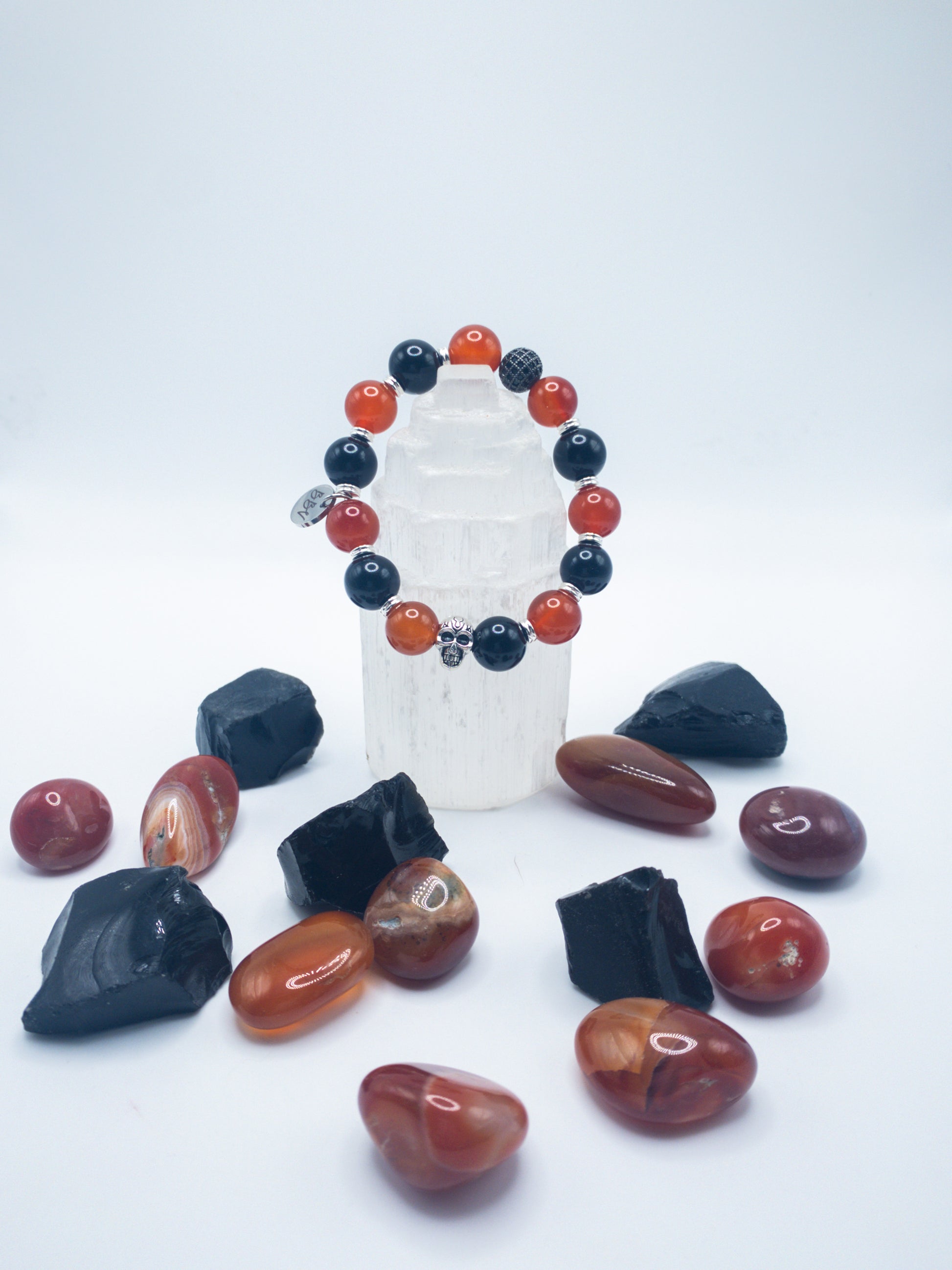 - Mixture of both stones with silver spacer accents, pave spacer bead and a choice of skull accent, carnelian heart accent or black tourmaline heart accent